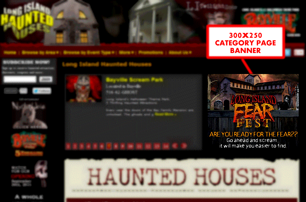 - Unlike National sites ALL our ad campaigns include coveted Home Page Exposure. Additionally, with banners & slider type ads that run throughout the site with listings showing up in priority placement above your competitors on county, city & category pages (Haunted Houses, Haunted Trails, etc).